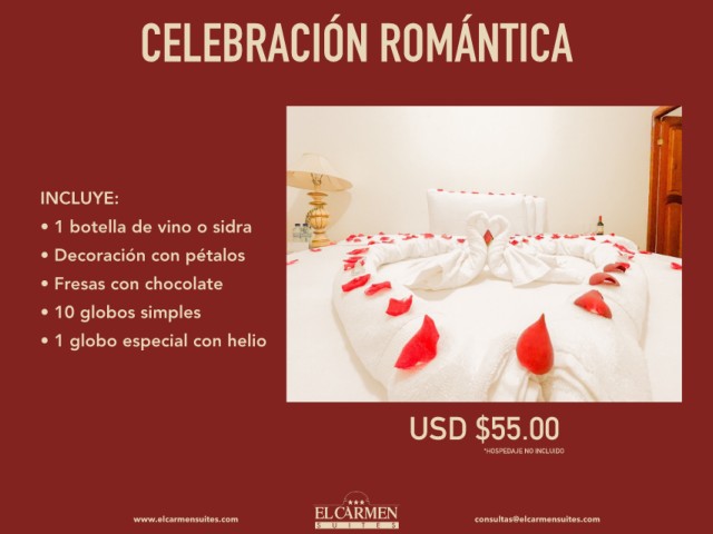 CELEBRACIÓN ROMÁNTICA INCLUYE: • 1 botella de vino o sidra • Decoración con pétalos • Fresas con chocolate • 10 globos simples • 1 globo especial con helio USD $55.00 *HOSPEDAJE NO INCLUIDO www.elcarmensuites.com consultas@elcarmensuites.com